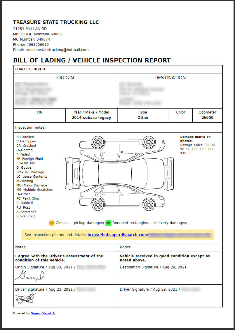 - Bill of Lading/Vehicle Inspection Report